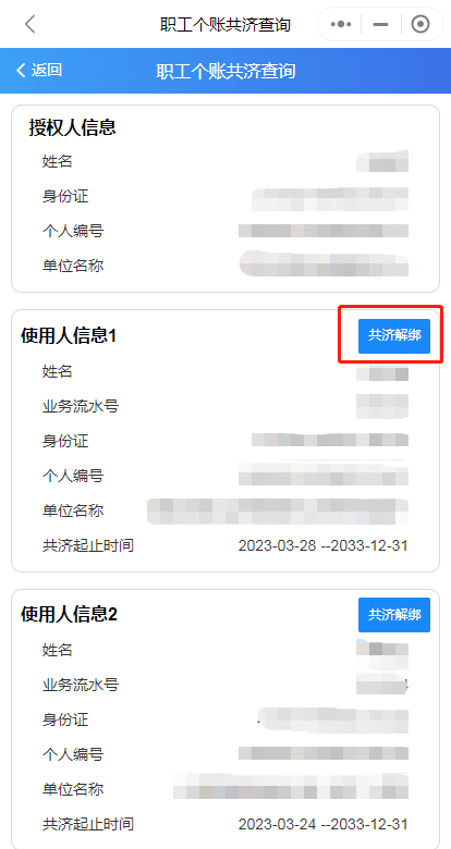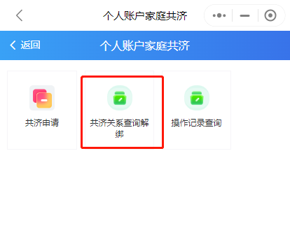 第四步:辦理完成后,可通過(guò)“家庭共濟(jì)”——“共濟(jì)關(guān)系查詢(xún)解綁”查詢(xún)綁定情況,“解除綁定”功能也可在此界面操作。