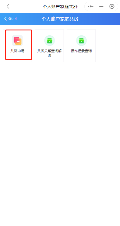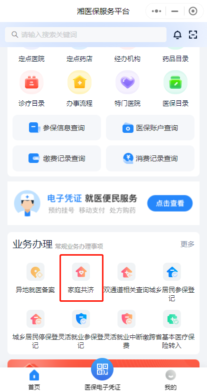 第一步:下載“湘醫(yī)?!盇pp,或進(jìn)入“湘醫(yī)保”App小程序,登錄后在首頁(yè)“業(yè)務(wù)辦理”中找到“家庭共濟(jì)”,點(diǎn)擊“共濟(jì)申請(qǐng)”。